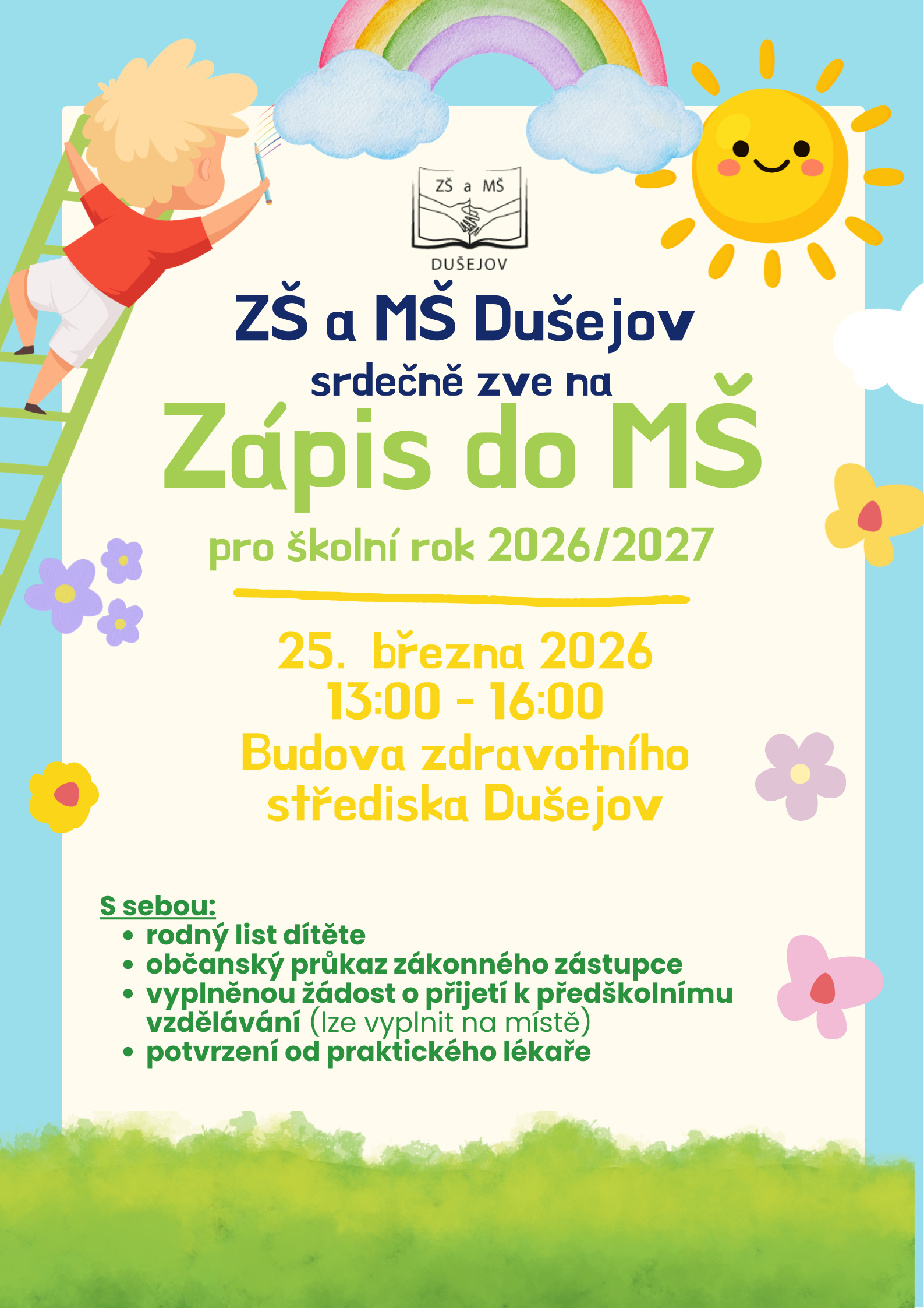 Zápis do mateřské školy pro školní rok 2026/2027 proběhne ve čtvrtek 25. března 2026 od 13.00 do 16.00 hod.